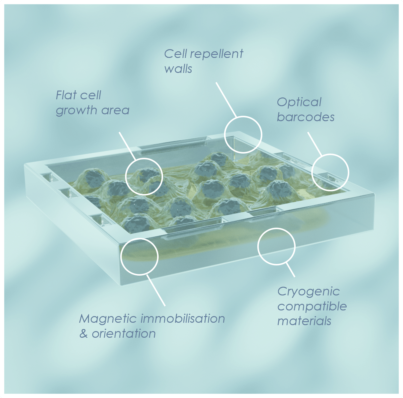 SemaCyte® microcarriers are ultra-miniaturised, optically barcoded micro-wells that turn adherent cells into automation-ready reagents. Cells are prepared in batches, optionally cryopreserved, then pooled and dispensed into standard microplates for imaging or plate reader assays. Brightfield visible barcodes enable dye free identification and software driven deconvolution, generating clean, cell type resolved datasets from multiplexed wells.